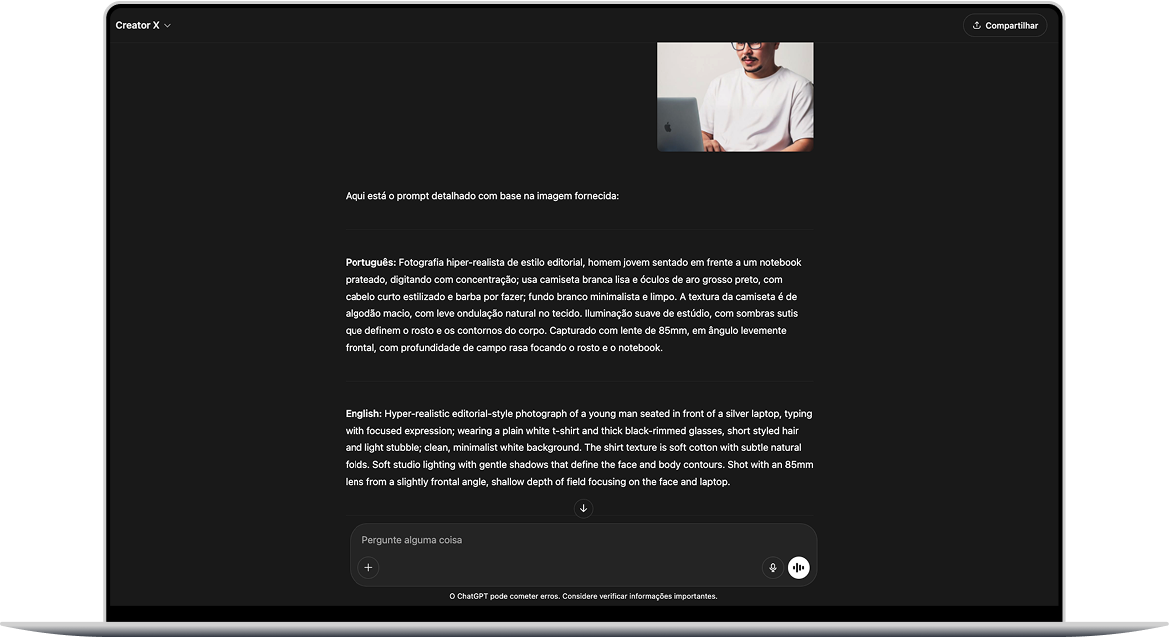Com o Creator X, você gera prompts automaticamente a partir de uma imagem. Resultados hiper-realistas com foco preciso em pose, textura, acessórios e composição fotográfica.